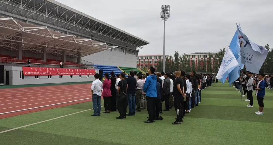 天蓝地阔,晨曦初露。8月26日上午,我校在盛乐校区东操场举行了2019—2020学年第一学期“开学第一课”升国旗仪式。全体校领导,副处级以上干部,行政人员、辅导员及盛乐校区全体学生出席仪式。校党委书记黄雅丽围绕“心怀爱国情 、笃定报国志、付诸强国行”主题作国旗下讲话。副校长刘九万主持仪式。习近平总书记强调:“爱国主义始终是激昂的主旋律,是中华民族民族精神的核心,始终是激励我国各族人民自强不息的强大力量。”开学第一课,就是要旗帜鲜明地进行爱国主义教育和民族团结教育,弘扬以爱国主义为核心的民族精神和以改革创新为核心的时代精神,不断增强全校师生“不忘初心、砥砺前行”的精神力量。习近平总书记在视察内蒙古时专程到内蒙古大学与师生交谈,勉励青年学子,体现了总书记对教育事业,尤其是高等教育事业的关怀和重视,让高校师生倍受鼓舞、倍感振奋、倍增信心。古往今来,爱国一直都是中华民族最为深厚的历史情感,流淌在中华儿女的血液之中,激荡在振兴中华的奋斗路上。今年是新中国成立70周年,中国已经取得了举世瞩目的成就,比历史上任何时期都更接近中华民族伟大复兴。我们应珍惜当下来之不易的美好生活,深入理解“家是最小的国,国是千万家”的家国情怀,始终听党话、坚定跟党走,坚持爱国和爱党、爱社会主义相统一,永远胸怀爱国之情,让爱国主义的伟大旗帜始终在心中高高飘扬。2019年8月24日是一个可以载入师大史册的日子。这一天,学校实现了行政主体搬迁,盛乐校区成为师大主校区,学校的发展也掀开了新的篇章。上学期,全校上下深入学习贯彻习近平新时代中国特色社会主义思想,认真落实学校第十一次党代会精神,坚持立德树人根本任务,积极践行以学生为中心的办学理念,努力为师生们提供舒适的学习生活环境。在中国特色社会主义进入新时代、“双一流”建设迈向新阶段之际,学校也在新学期开启了承前启后、继往开来的新征程。学校将始终高举习近平新时代中国特色社会主义思想伟大旗帜,全面贯彻党的十九大和全国教育大会精神,坚持立德树人,坚持以本为本,坚持内涵建设,坚持开放办学,守正创新,砥砺前行,奋力开创“双一流”建设新局面,为把学校建设成为特色鲜明的创新型高水平综合性师范大学而奋斗。