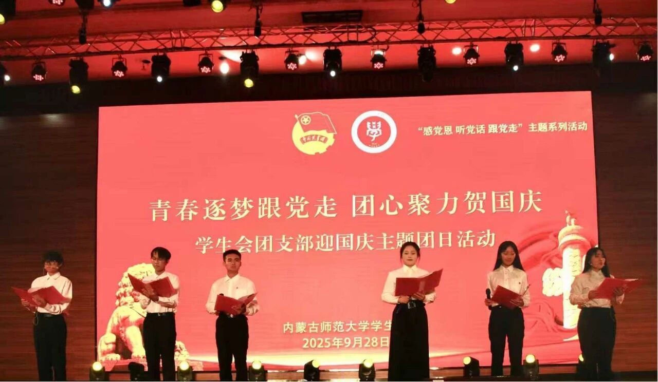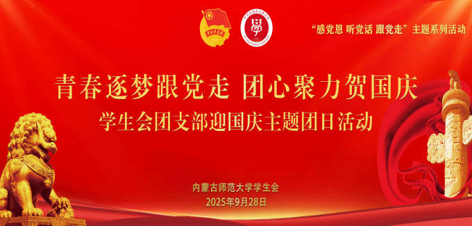 为庆祝中华人民共和国成立76周年,深入学习贯彻习近平新时代中国特色社会主义思想,引导青年学生厚植爱国情怀、坚定理想信念,将“感党恩、听党话、跟党走”的信念转化为实际行动,2025年9月28日,内蒙古师范大学学生会团支部开展“青春逐梦跟党走 团心聚力贺国庆”主题团日活动,以丰富多元的形式凝聚青春力量、共贺盛世华诞。