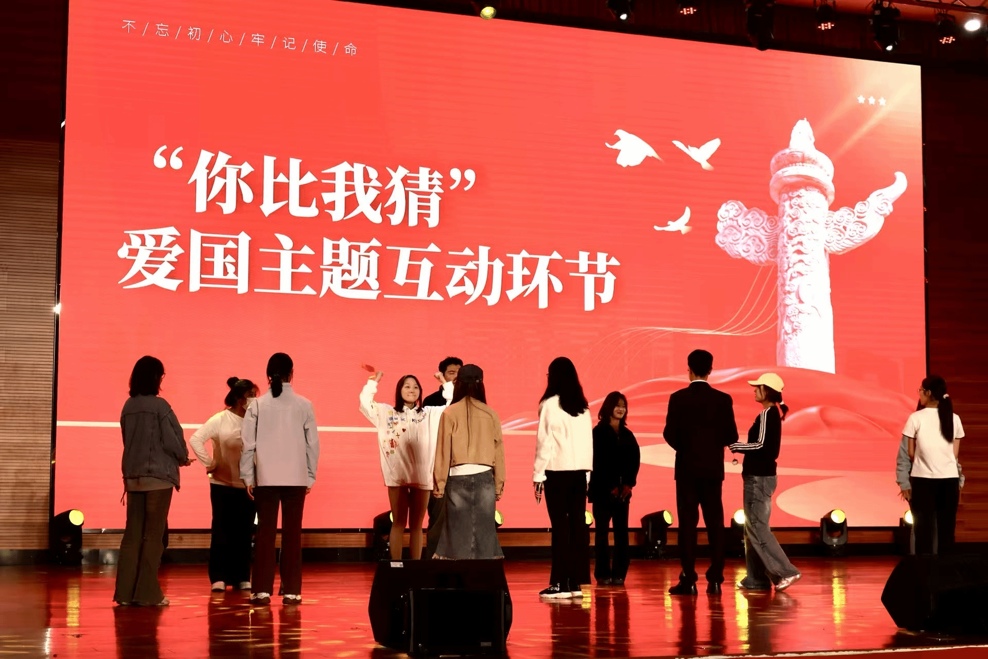 诗歌朗诵《青春为中国式现代化挺膺担当》,以铿锵语调描绘青春奉献姿态,点明青年服务北疆、助力发展的使命。“你比我猜”爱国主题互动环节,5组参赛同学在90秒内,通过肢体比划与默契配合,猜答“天安门”“长征”“脱贫攻坚”“航天梦”等100个爱国主题词语,在欢声笑语中强化了对国家发展成就与中华民族精神的认知。