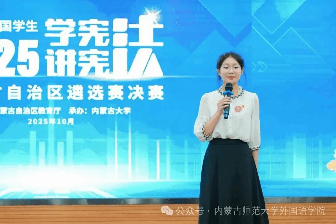 10月19日,第十届全国学生“学宪法 讲宪法”活动内蒙古自治区遴选赛决赛在内蒙古大学举办。经过激烈角逐,我校外国语学院2025级英语二班李妍坤同学表现优异,荣获高校组演讲比赛三等奖。