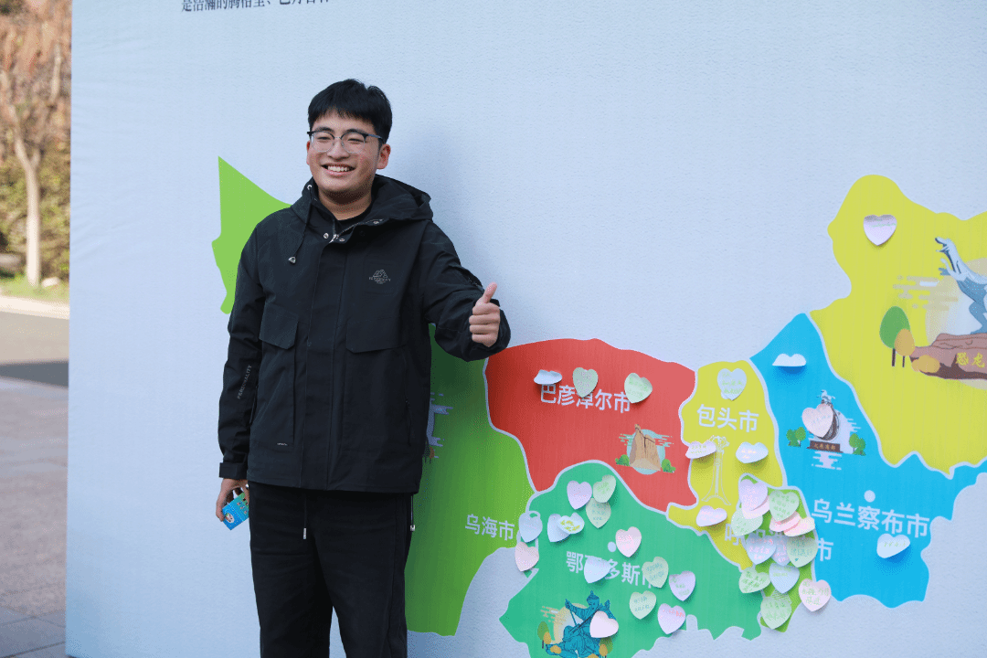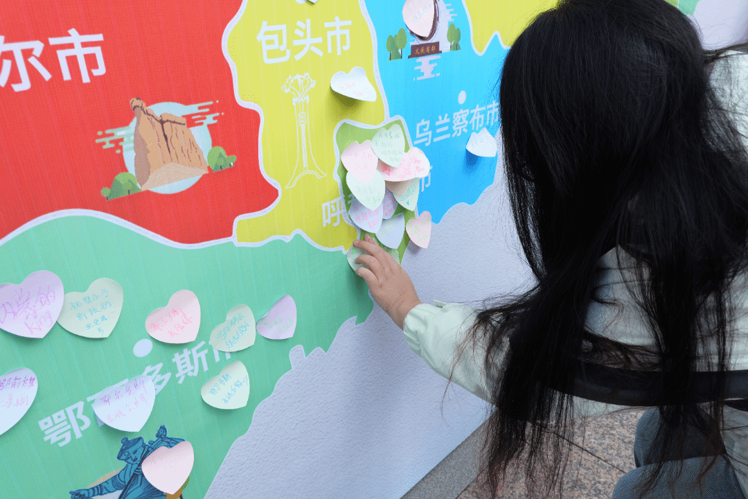 活动开始,一面贴有内蒙古12个盟市名称的“祝福墙”便吸引了大家的注意。同学们纷纷在心形卡片上写下对各自盟市的美好祝愿。来自不同盟市的同学主动走上讲台,化身“家乡代言人”,向大家介绍自己的家乡,让在场师生感受到了内蒙古的壮美与深情。