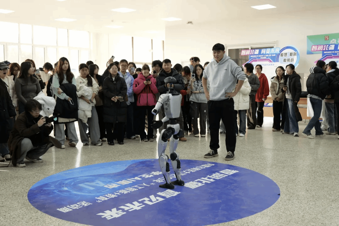 活动现场氛围热烈浓厚,各类 AI 创新作品亮点纷呈、引人驻足。在应用展示区,飞扬工作室、梦航无人机社团、北疆低空智航创新工坊等学生社团,计算机科学技术学院、人工智能学院相关学生团队通过机器人、四足仿生机器人(机器狗)、轮腿自平衡机器人、无人机、“基于5G的AI机械手”等不仅展示了技术成果和人工智能的应用前景,更分享了项目背后的奋斗故事,激发学生的好奇心与创造力。AI 心理咨询展位前,同学们通过AI学工智能交互系统体验心理测评与疏导服务,感受科技赋能心理健康教育的温暖力量;AI信息素养展区内,智能检索、数据可视化等技术应用演示,让师生直观领略人工智能在提升学习效率中的实用价值。最受关注的仿生机器人表演环节,灵活的肢体动作搭配动感音乐节拍,展现出前沿科技的独特魅力,现场掌声与惊叹声此起彼伏,同学们纷纷踮脚观看、举起手机记录精彩瞬间,眼中满是对科技探索的浓厚兴趣与无限向往。