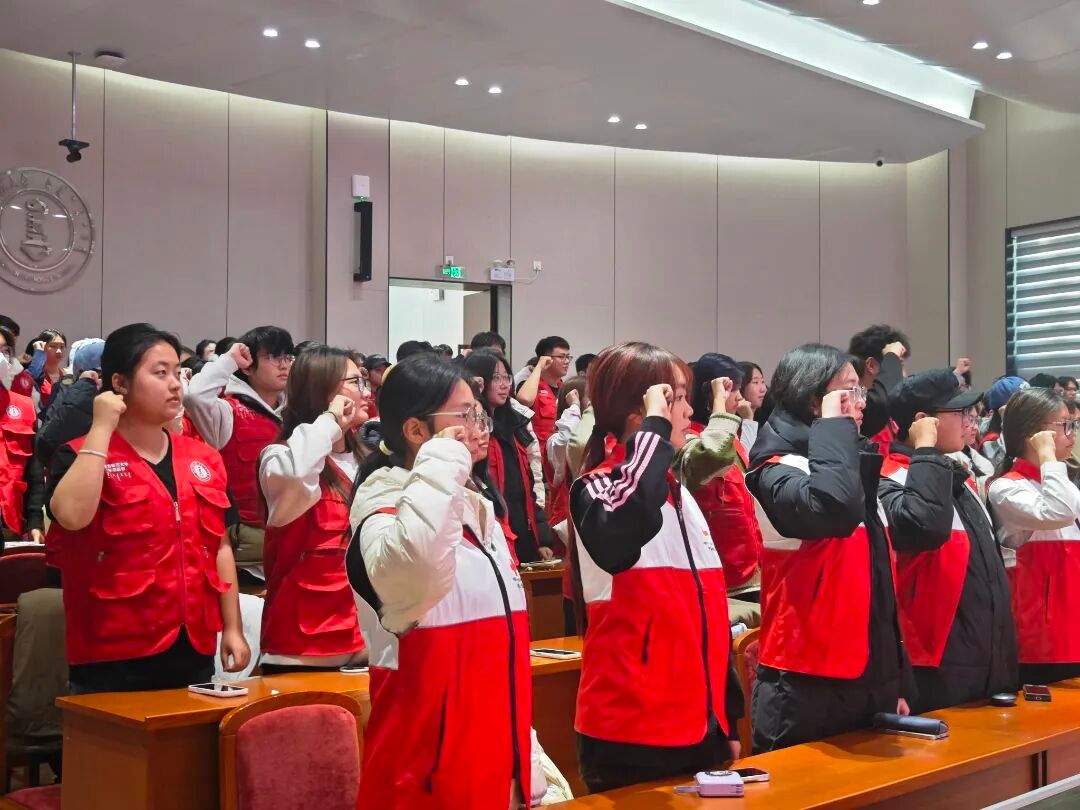 在领誓人的带领下,全体志愿者肃立,举起右拳,进行了庄严的宣誓:“我志愿成为一名中国红十字志愿者......”铿锵有力的誓言在会场内回荡,彰显着师大青年投身志愿者服务,奉献社会的坚定决心,这是我们对社会许下的郑重承诺。