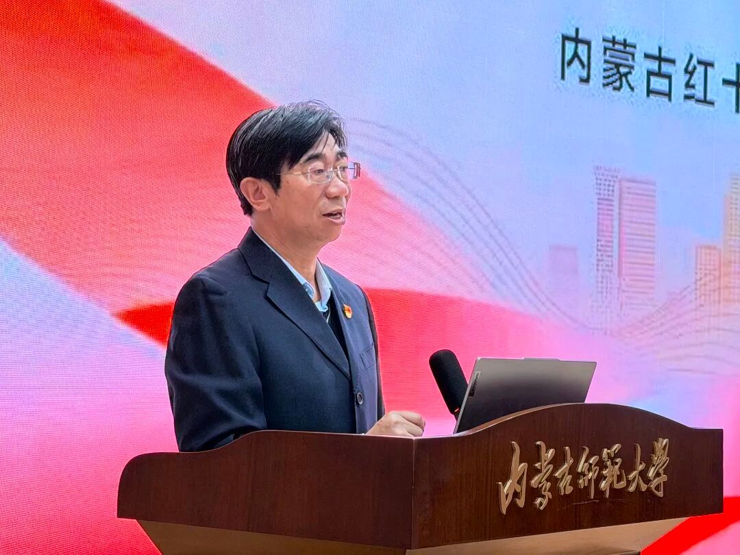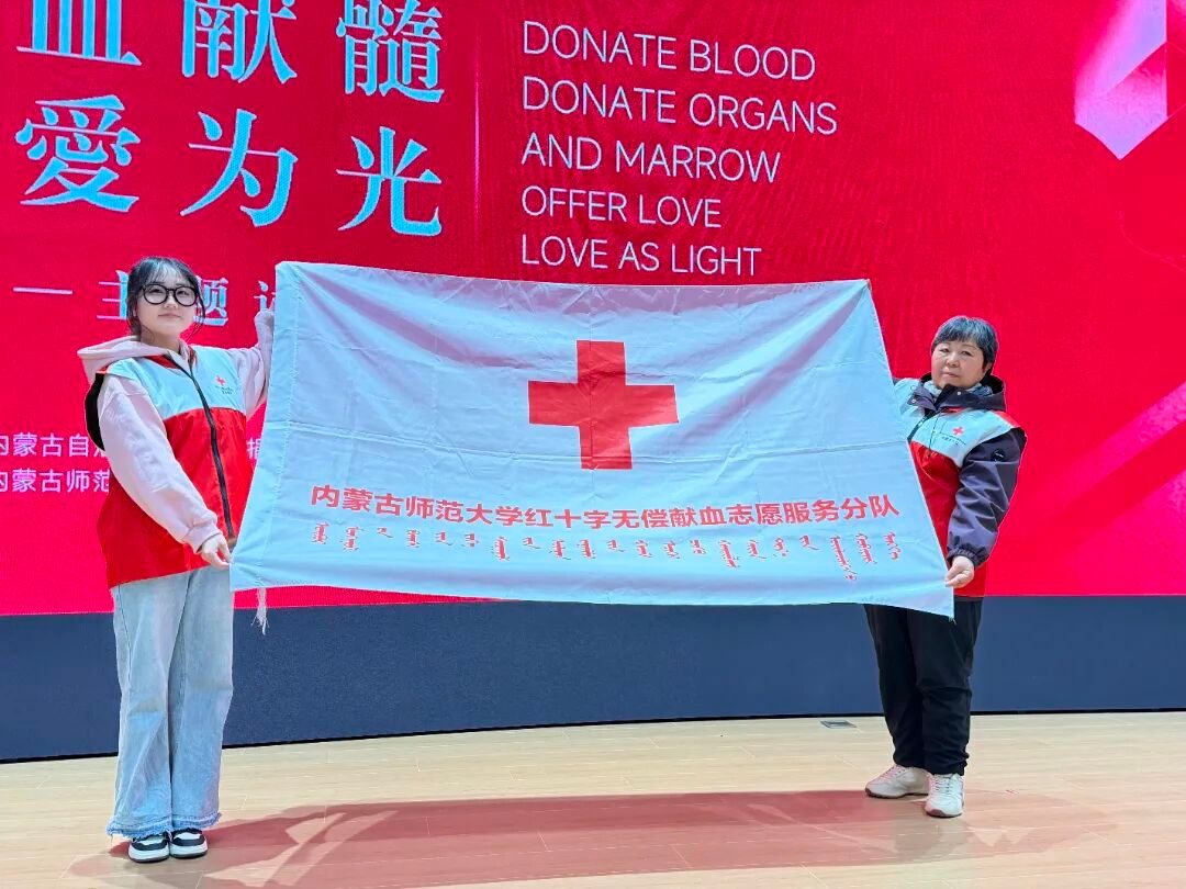现场最动人的一幕,是魏刚老师引荐的一位坚持无偿献血数十年的老人。这位长者缓步上台,花白的头发见证着岁月的痕迹,却掩不住眼中坚定的光芒。当她把内蒙古师范大学红十字无偿献血志愿服务分队的队旗交到我校志愿者服务总队代表的手中时,全场响起经久不息的掌声。没有过多的言语,但那份沉甸甸的奉献与坚守,却在这一接一递中,深深地烙印在了我们每个人的心里。
