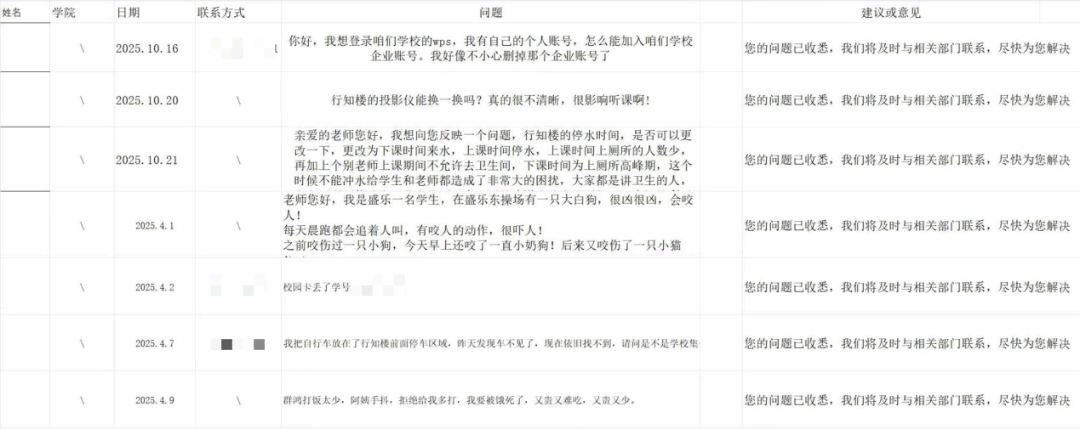 工作人员将问题分类整理,建立“接收-核实-协调-反馈”闭环处理机制,及时对接学校相关部门跟进处理,并于3月15日活动当天,通过线上平台公布部分问题处理结果,让每一个诉求都有落地、每一次反馈都有回应。