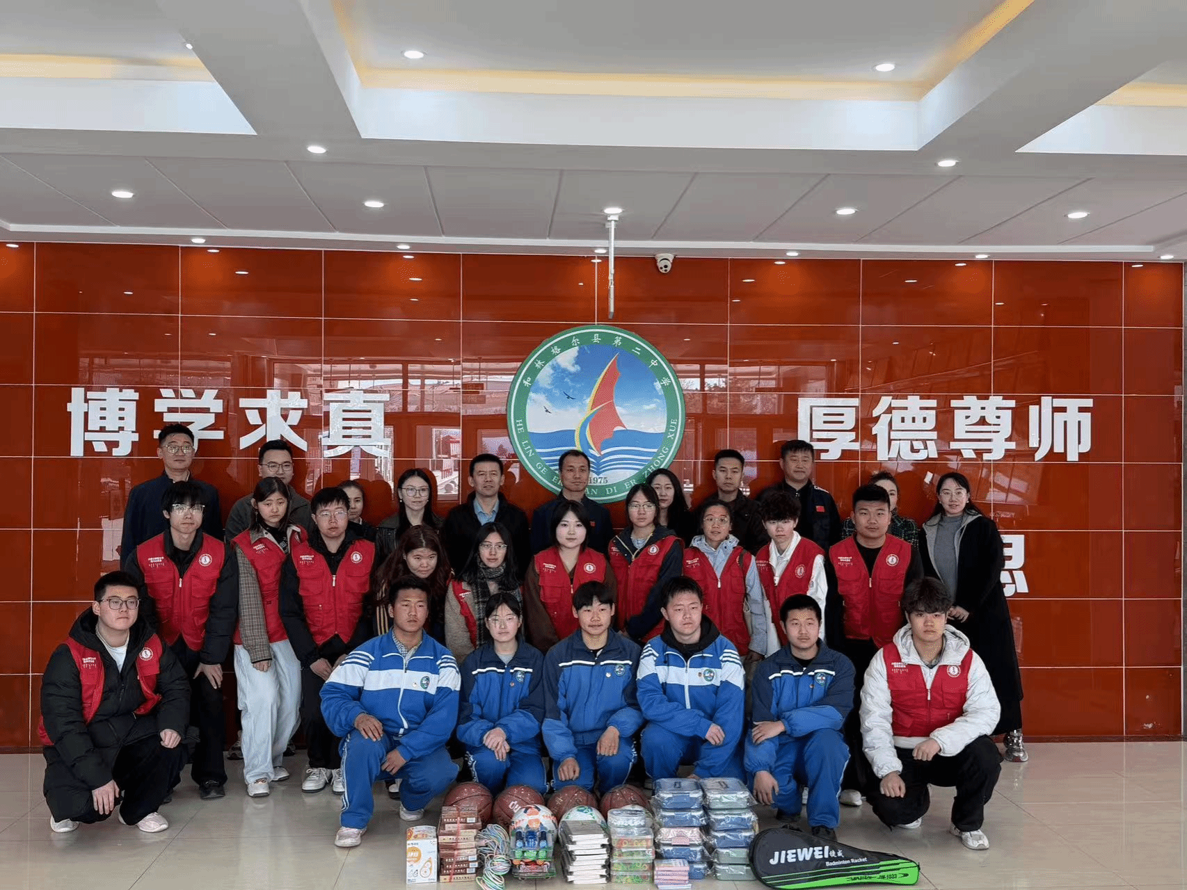 校团委全体党员慷慨解囊为5位结对帮扶同学爱心捐款,送上祝福,传递爱心,用心用情助力学子健康成长。同时,还向和林格尔县第二中学捐赠足球、篮球、排球等体育用品及学习用品,以真情实意助力青少年成才。